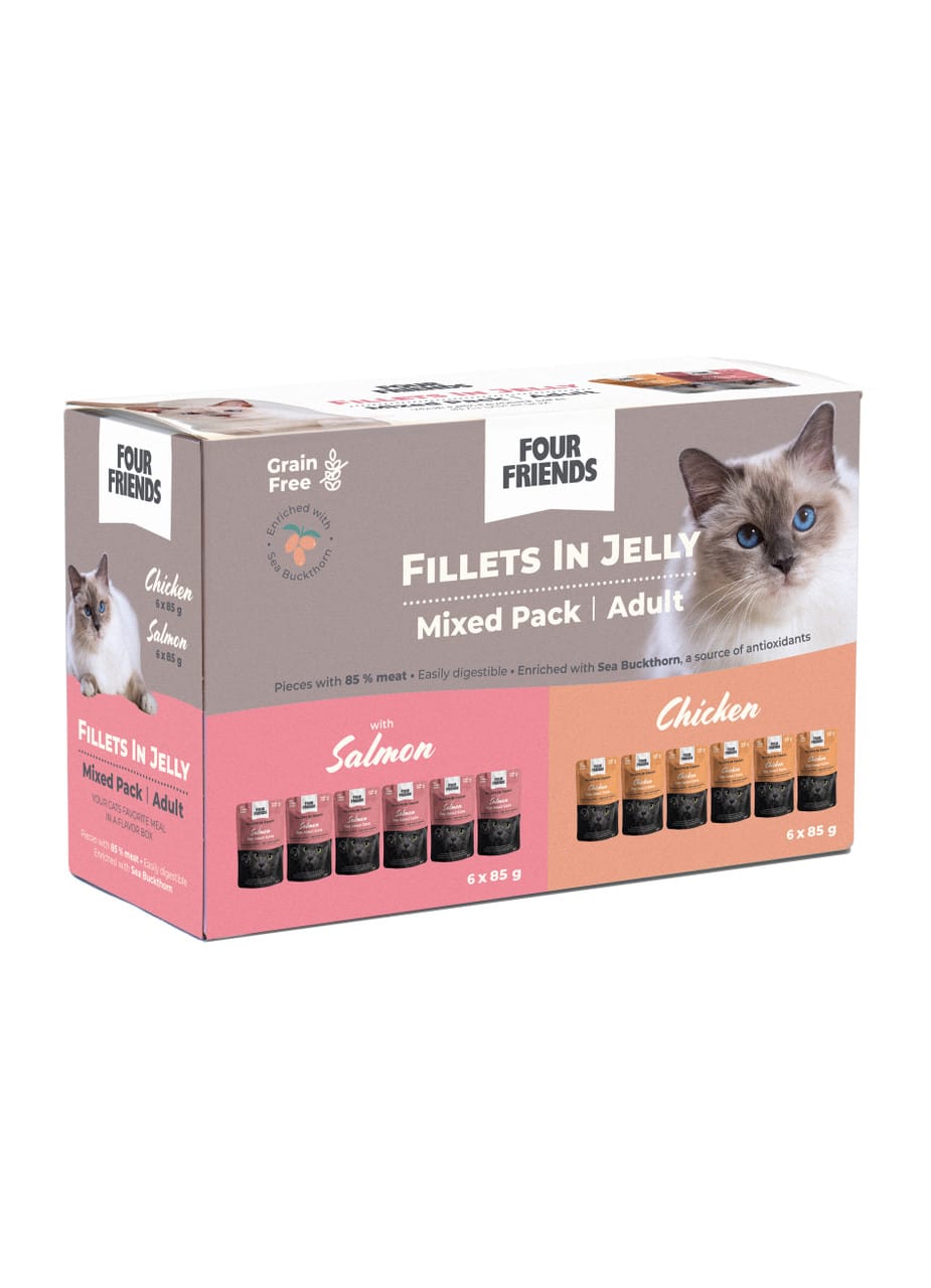 Adult in Jelly Mix 12-pack från FourFriends är ett komplett och balanserat helfoder för vuxna katter. Förpackningen innehåller 12 portionspåsar med saftiga filébitar i gelé, framtagna för att ge både god smak och en näringsmässigt komplett måltid.