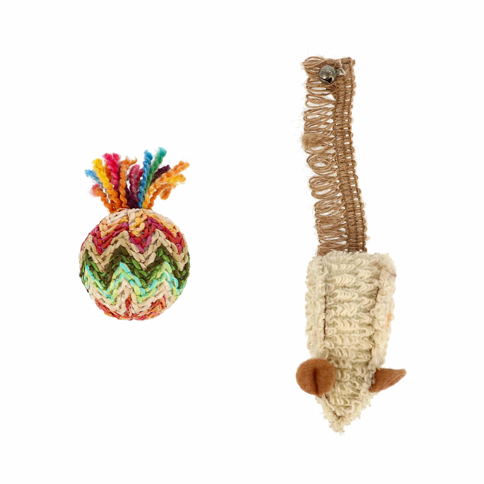Färgglad boll i grov twillväv. Neutral mus med pingla längst ut på svansen. Båda innehåller Kattmynta. Storlek på mus: 18x4x3cm.