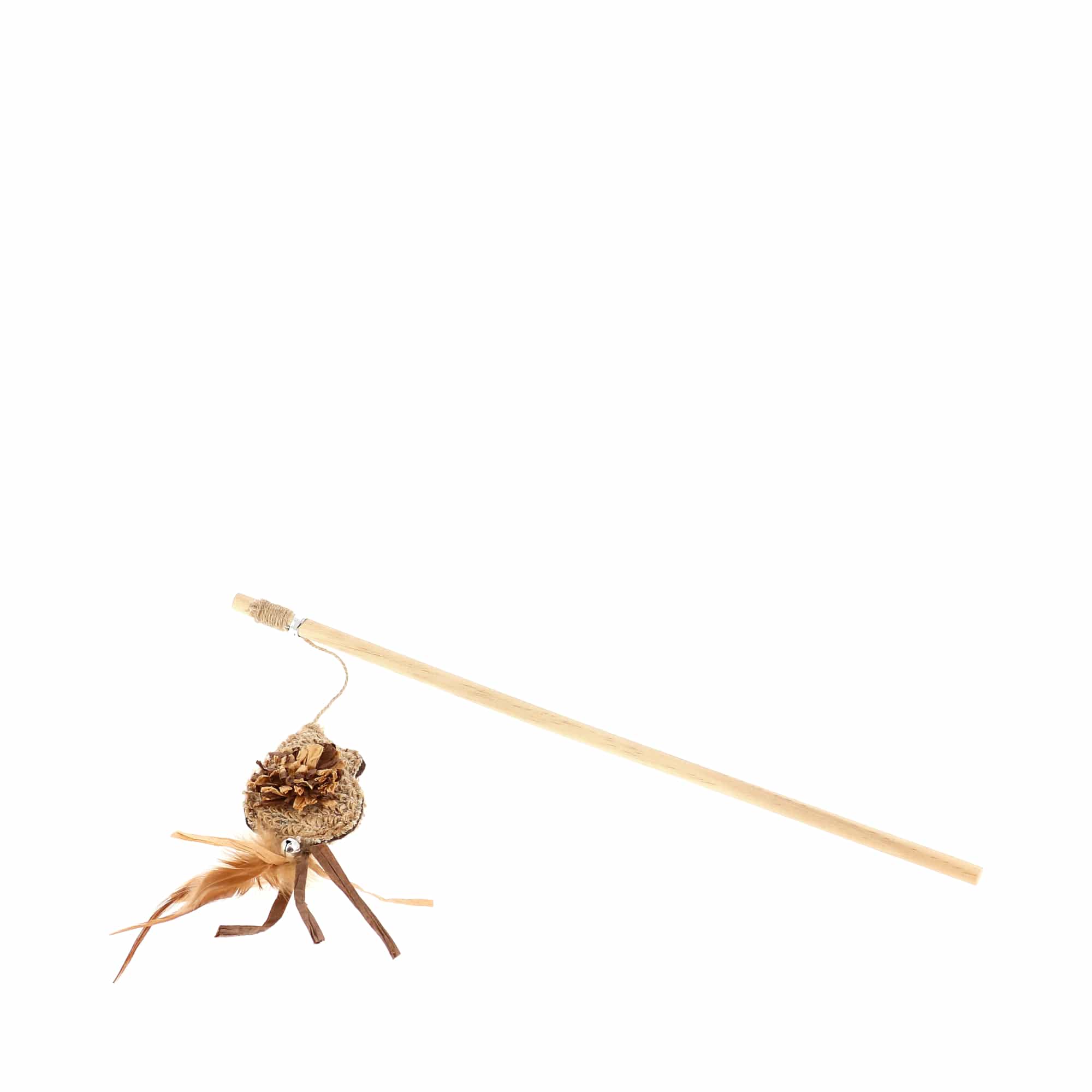 Kattspö med en mus av juteväv.Med en fin fjädersvans. Innehåller kattmynta. Storlek: 40×5 cm.