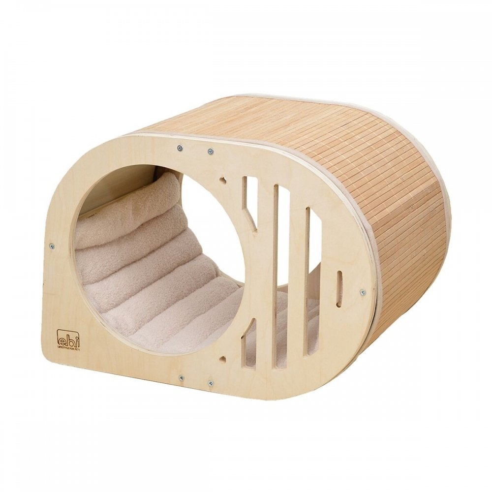 Med en yttersida av bambu och en inbyggd stoppning som är fäst med kardborreband, är kattgrottans kudde både stilren och funktionell. Den konstgjorda pälsen på kudden ger extra komfort, medan den snygga sömmen i kudden säkerställer att stoppningen förblir jämnt fördelad.