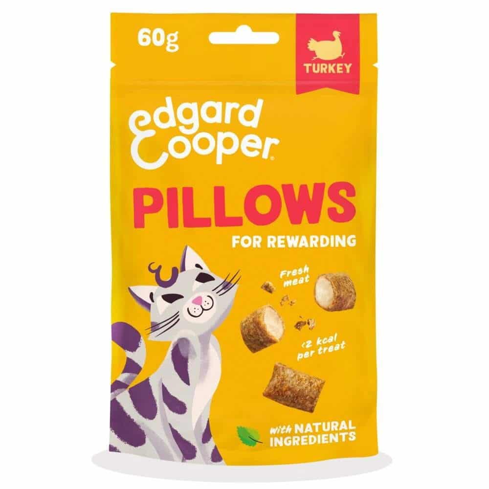 Edgard & Cooper Pillows med smak av kalkon och kyckling är ett perfekt alternativ för daglig belöning. Dessa godbitar har en krispig utsida och en mjuk, krämig insida som tilltalar även den mest kräsna katten.