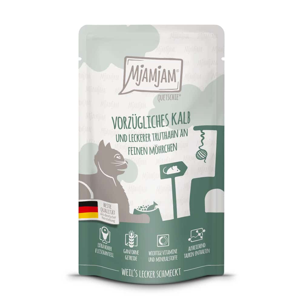 MjAMjAM Quetschie finns i flera goda kombinationer med både animaliska och vegetabiliska ingredienser, så att katten kan njuta av omväxling i matskålen.