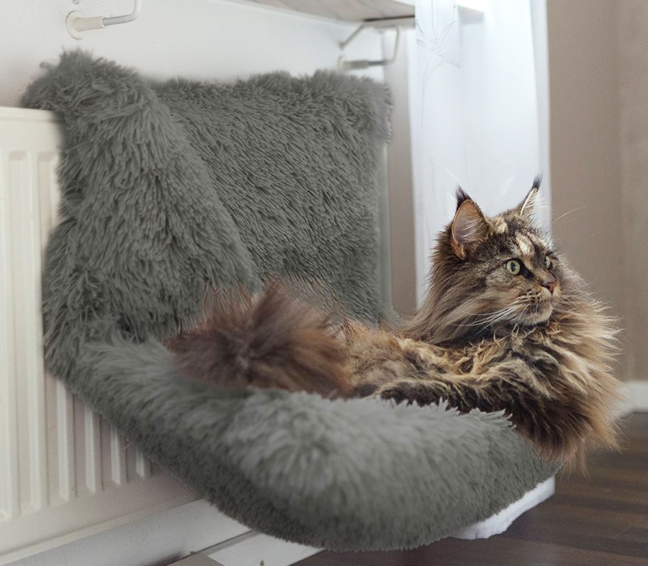Elementsäng i lurvigt mysigt grått tyg som passar fint in med hemmets inredning. Perfekt för att skapa en varm och mysig plats för din katt att ta tupplurer i.