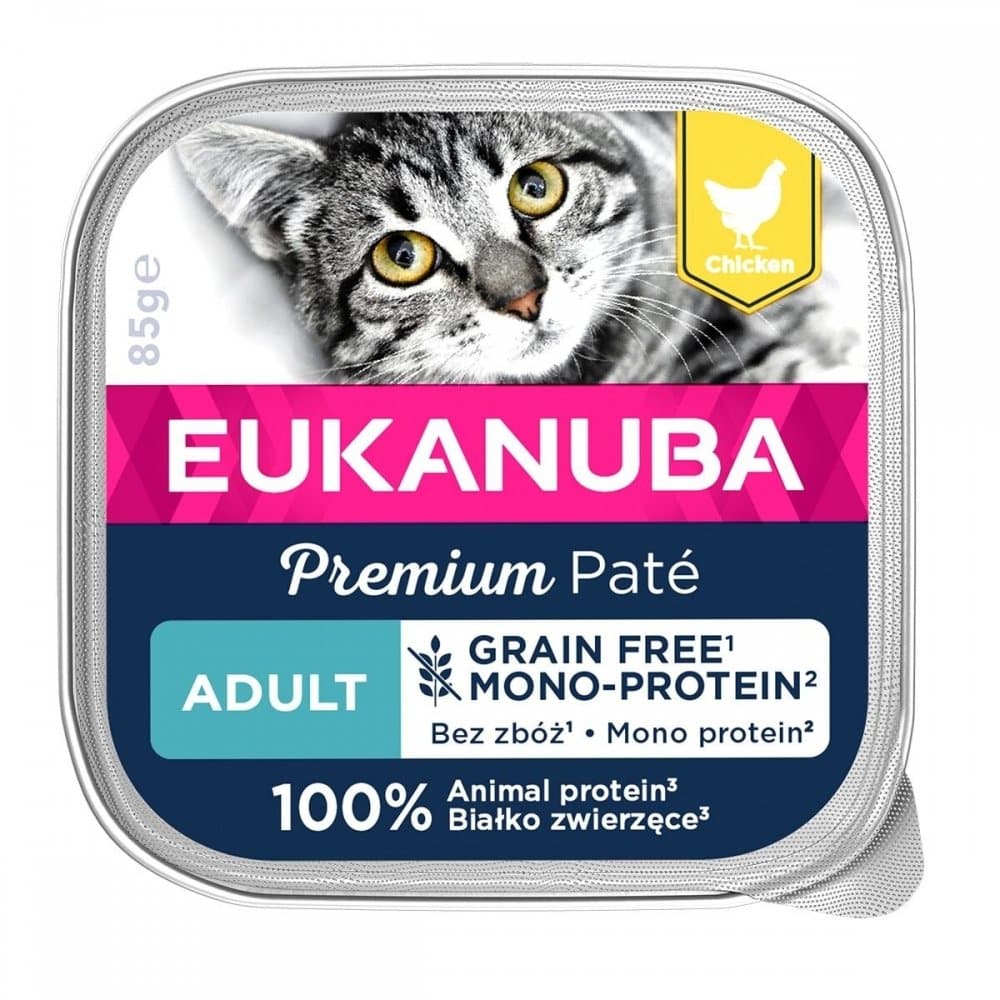Eukanuba Cat Grain Free Adult Chicken 85 g, är ett läckert våtfoder speciellt utvecklat för vuxna katter. Huvudingrediensen är proteinrik kyckling, om är lättsmält och skonsamt för kattens mage.