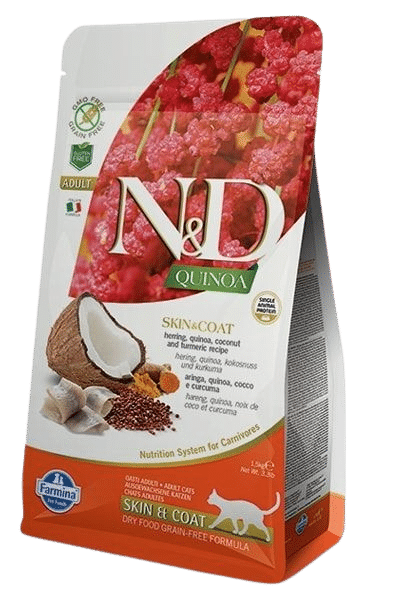 Farmina N&D Quinoa Skin & Coat Herring är ett högkvalitativt och näringsrikt kattfoder utvecklat för att stödja hud- och pälshälsa hos vuxna katter.