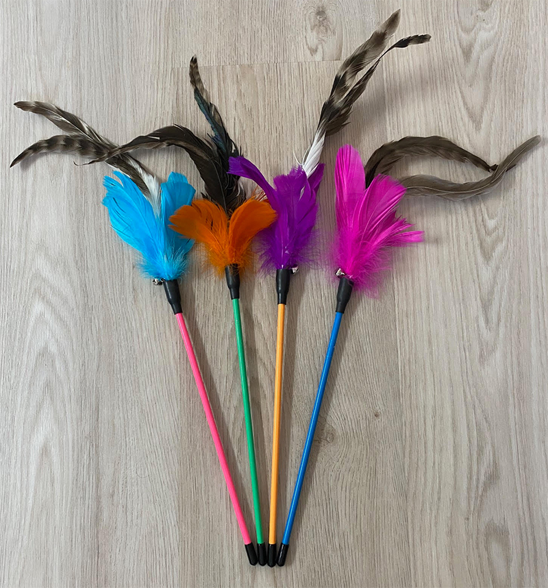 Långa, mjuka fjädrar: Cirka 15–20 cm, som fladdrar lockande och väcker kattens jaktinstinkt