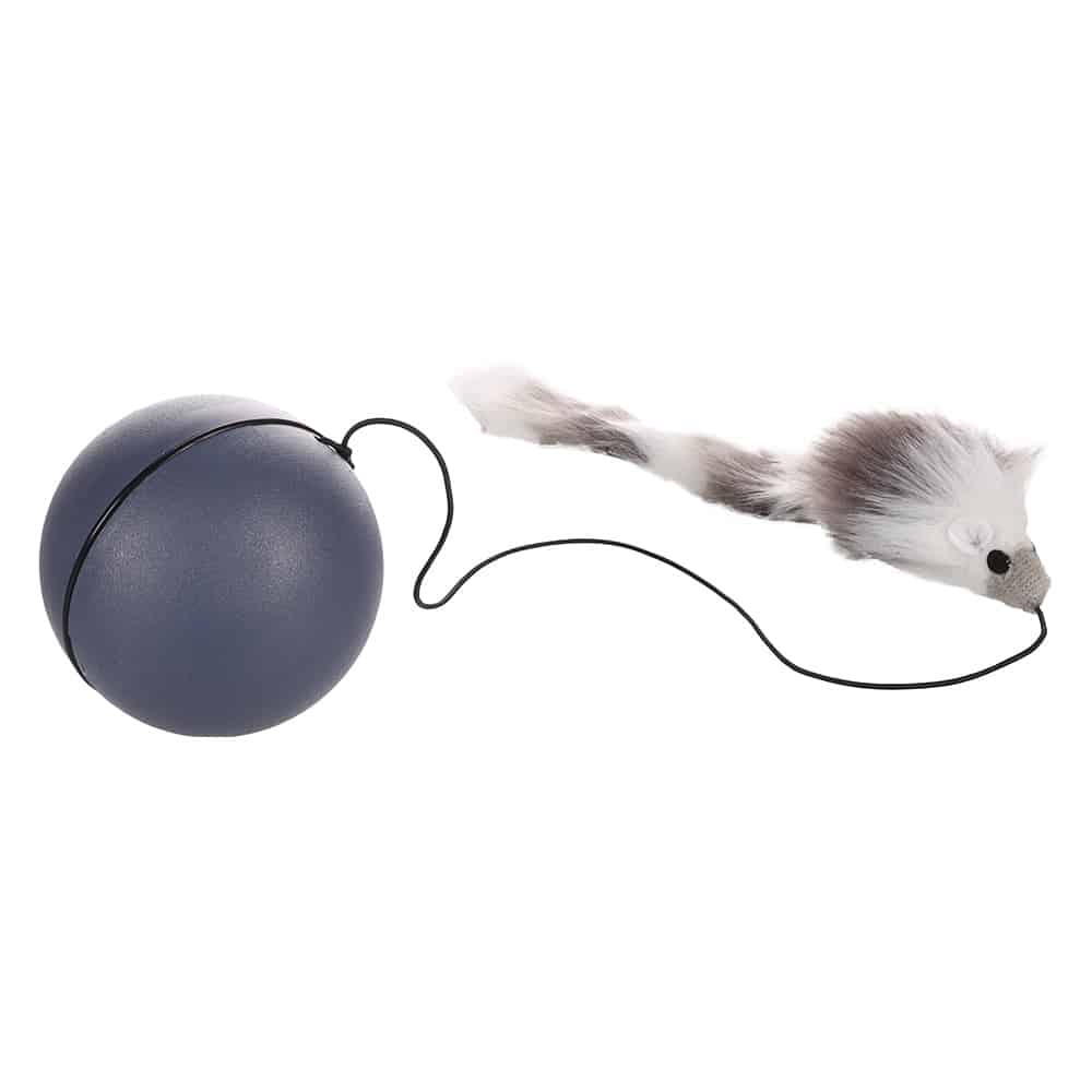 När leksaken är påslagen rullar den stora lekbollen fram i sicksack, medan den rasslande plyschmusen, som är fäst vid ett gummiband, skumpar efter. De oförutsägbara rörelserna och leksakens pälsimitation lockar katter att leka och jaga – tråkigt blir det aldrig!