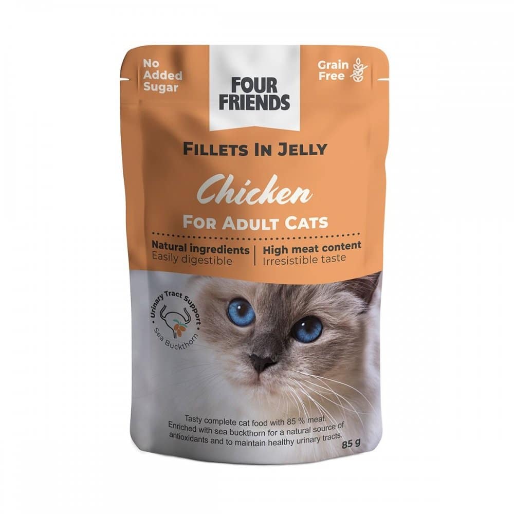 Varje förpackning av Four Friends Cat Adult Chicken in Jelly innehåller 85 gram våtfoder, vilket är den optimala portionen för en vuxen katt. Förpackningarna är enkla att öppna och förvara, vilket gör det lätt att servera en färsk och välbalanserad måltid till din katt varje dag.