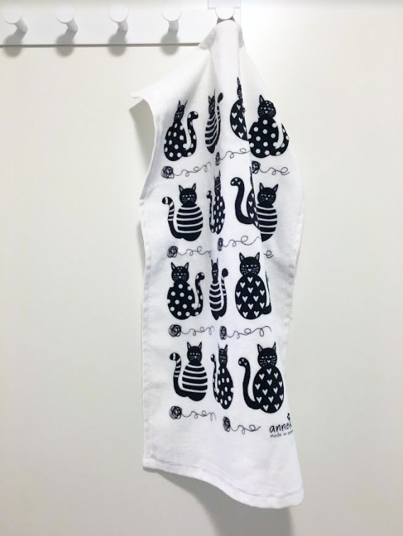 Denna fina frottehandduk pryds av ett härligt kattmotiv från AnnEko design. Handduken är tillverkad i 100% bomull och är tvättäkta i 60°C. Den är dessutom tryckt med vattenlöslig och miljövänlig färg!