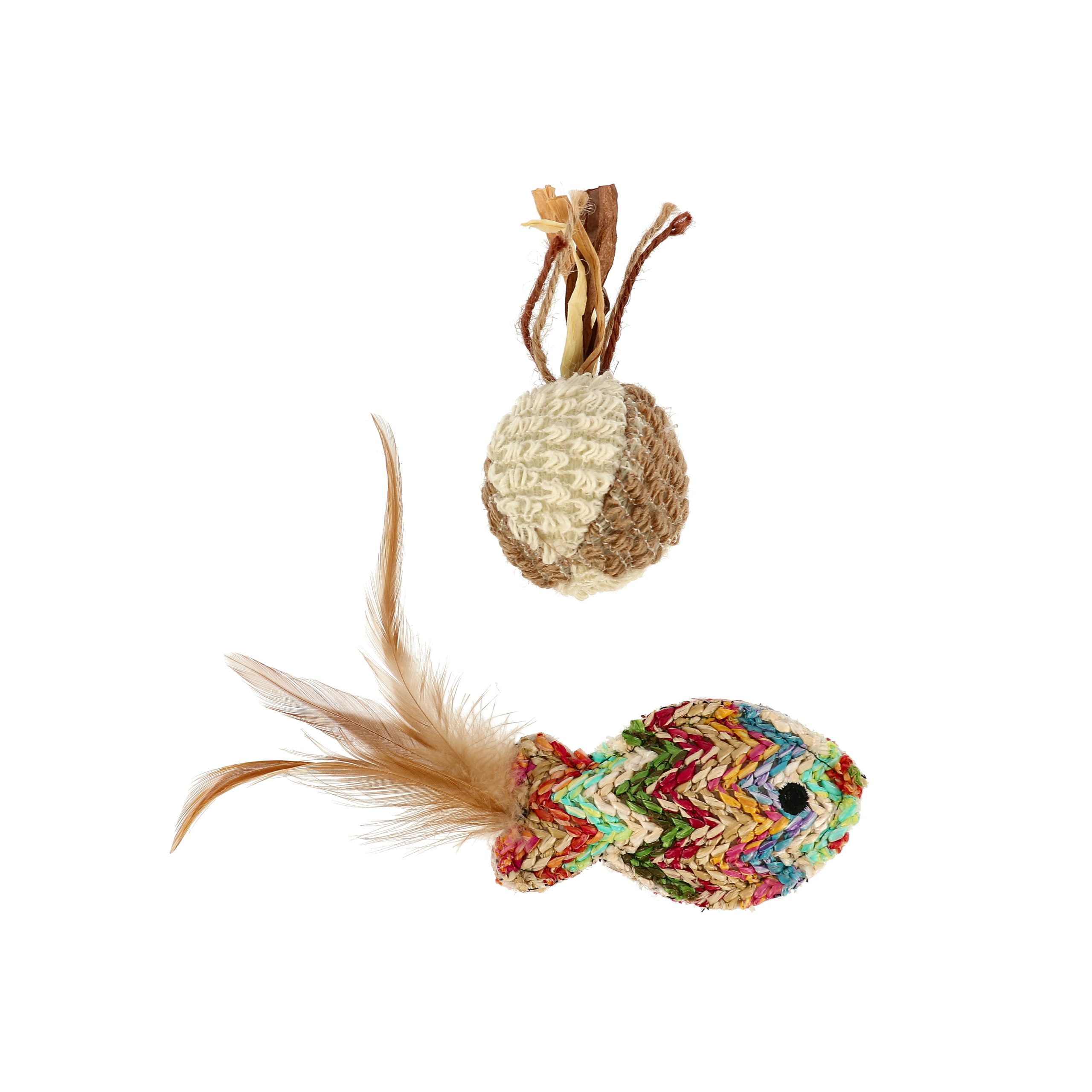 Färglad fisk i grov twillväv och en neutral boll. Båda innehåller Kattmynta.