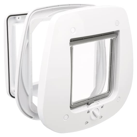 Tillverkad i plast med en mjukstängande, transparent svänglucka. Kattluckan har en TPR-gummilist runt hela öppningen och ett magnetlås som förhindrar att luckan slår i vinden.