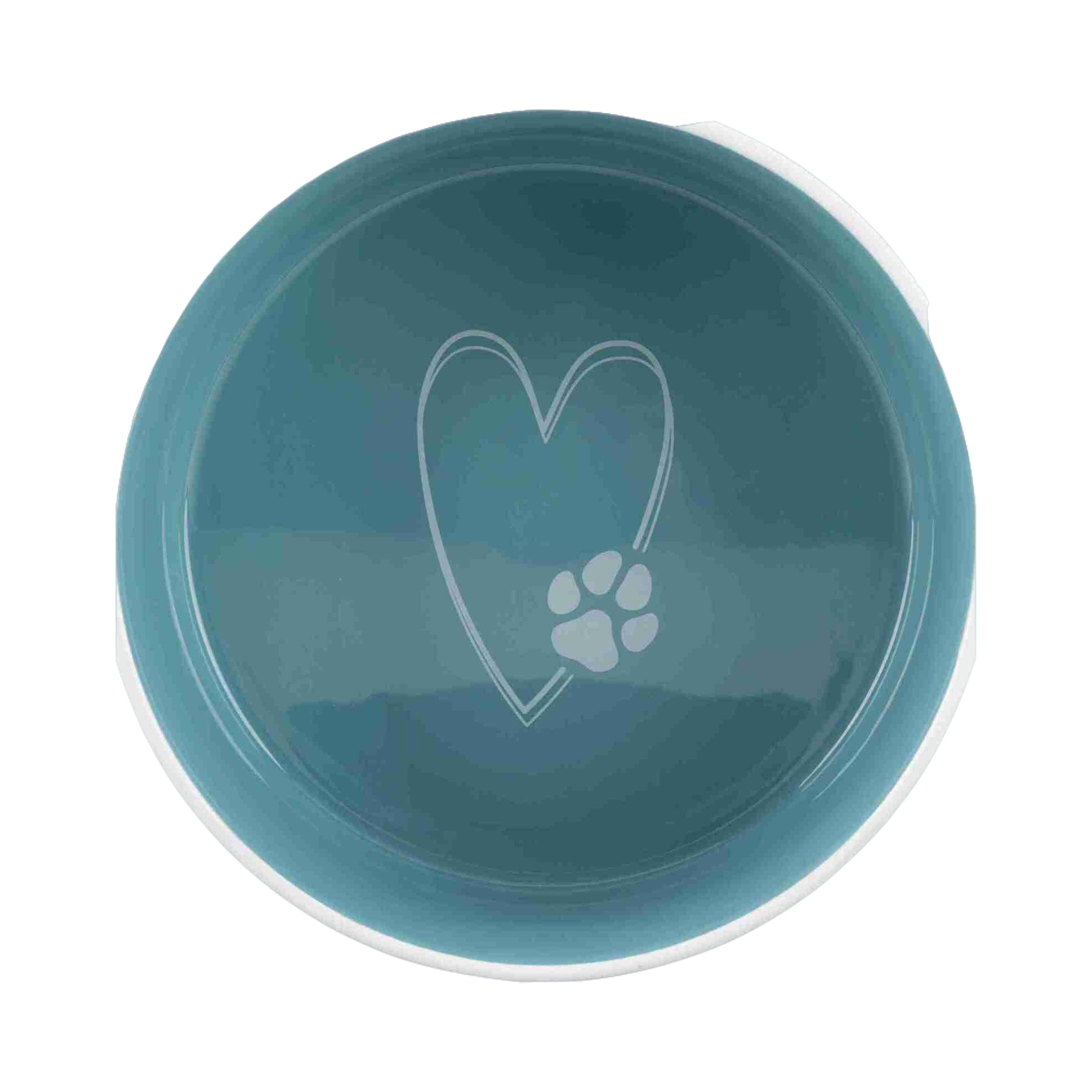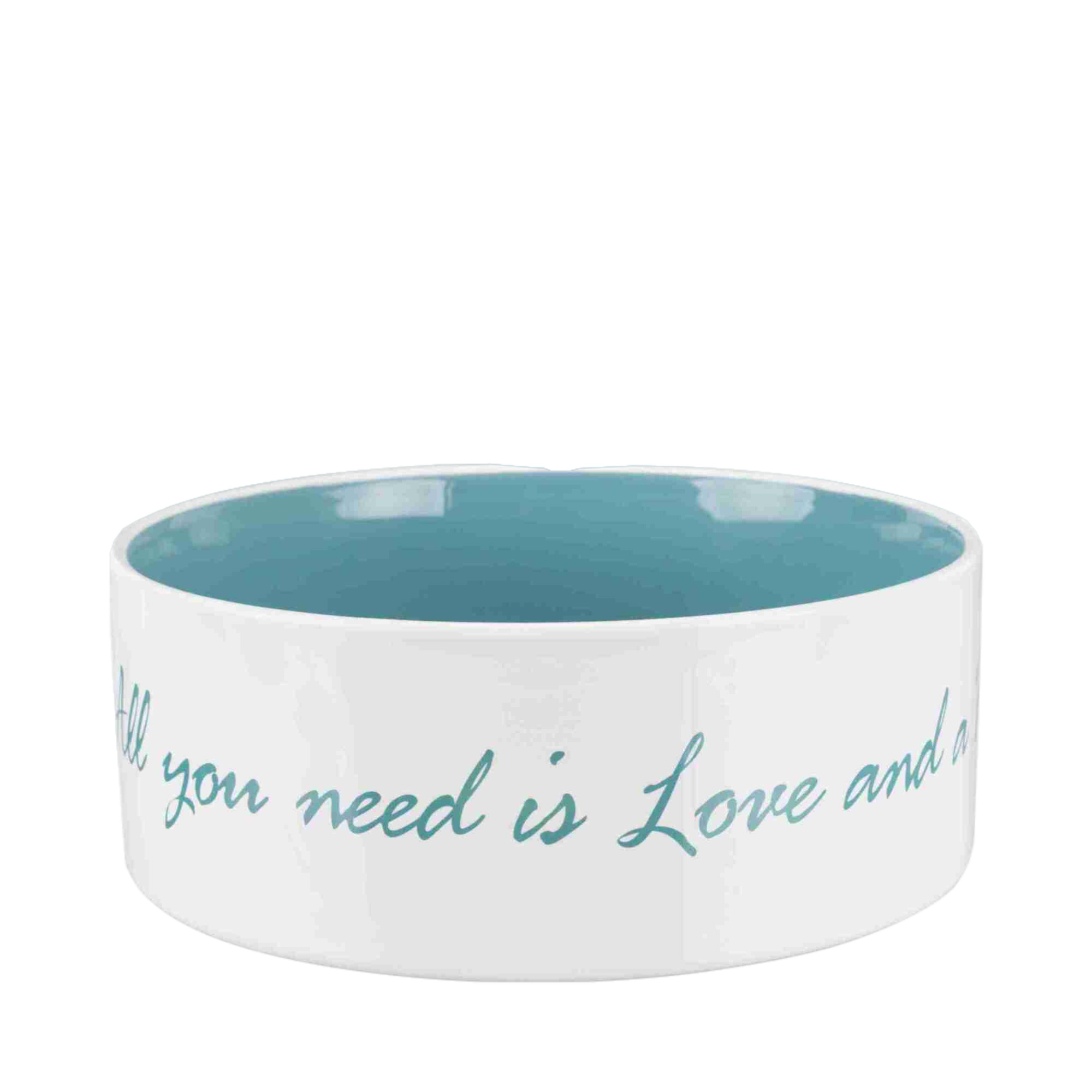 Snygg design med vit utsida och ljus turkos petrolfärg på insidan. Keramikskålen har fin text på utsidan ”All you need is Love and a Pet” och ett hjärta i botten av skålen.