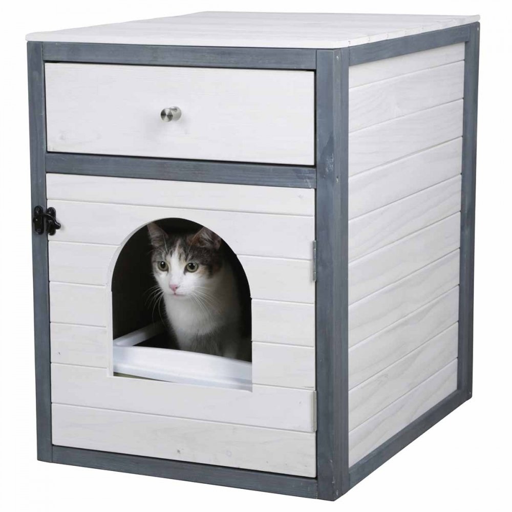 Upptill finns en praktisk låda där du kan förvara kattens saker såsom exempelvis kattspade, borstar eller klosax.