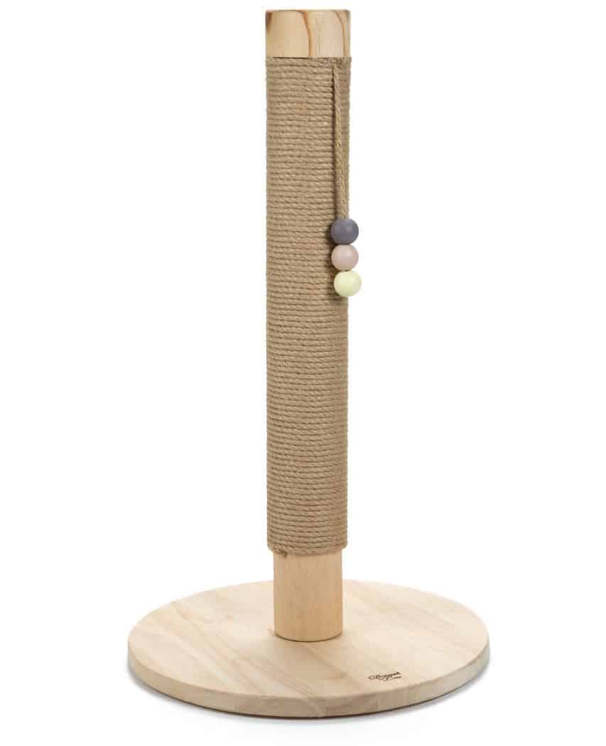 Såå fin klösstolpe till din katt, en klöspelare som verkligen gör sig fin i hemmet. Sinora klöspelare är tillverkad i trä med ett lindat och limmat juterep. På ena sidan hänger en dekorativ leksak med tre träkulor.