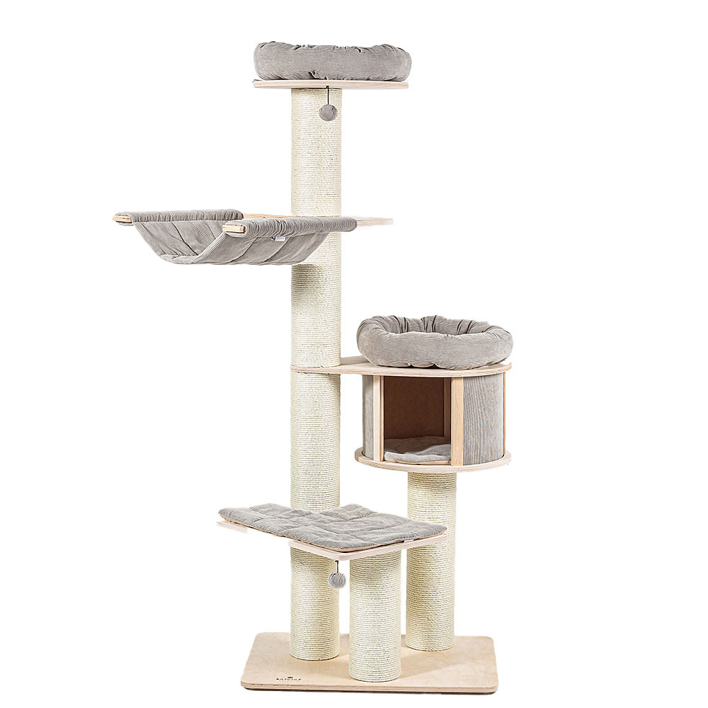 De kraftiga klösstammarna är beklädda med naturlig sisal, vilket ger katten gott om utrymme att sträcka ut kroppen och vårda sina klor – ett viktigt beteende för både fysisk och mental hälsa.