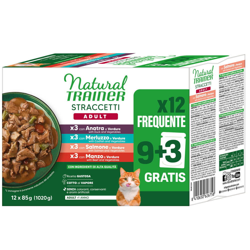 Natural Trainer Straccetti Adult strimlor i sås är ett högkvalitativt våtfoder för katter som bjuder på saftiga strimlor i en lockande sås. Tillagningen sker varsamt i sin egen juice, vilket hjälper till att bevara råvarornas naturliga smaker och värdefulla näringsämnen. Receptet är komplett och balanserat och kan ges dagligen som basföda.