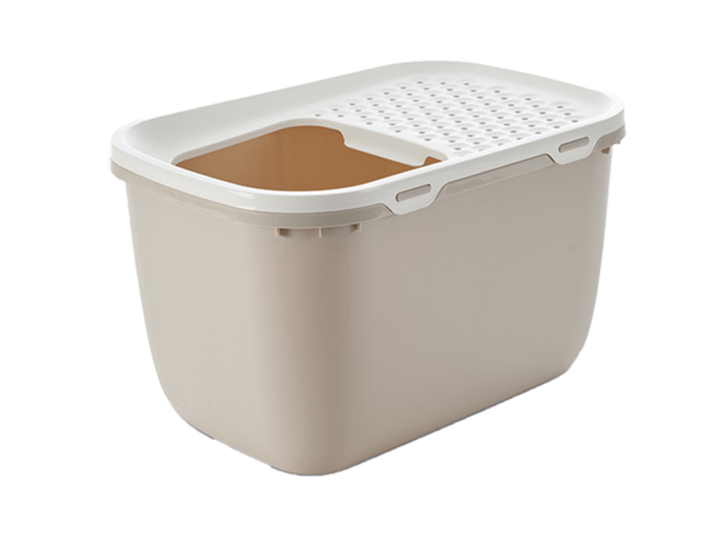 Det lätt sluttande, perforerade locket är utformat för att fånga överflödigt skräp och låta det falla tillbaka i tråget när katten lämnar lådan. Denna funktion bidrar till att hålla området runt kattlådan rent.