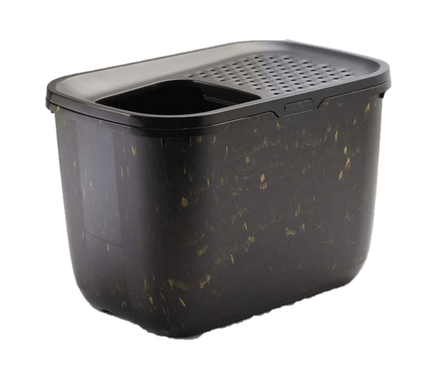 De upphöjda kanterna på Hop In kattlåda håller strö, vätska och smuts inne. När katten lämnar lådan faller kattsanden tillbaka in genom hålen på locket, vilket minskar spridningen av kattsand runt omkring.