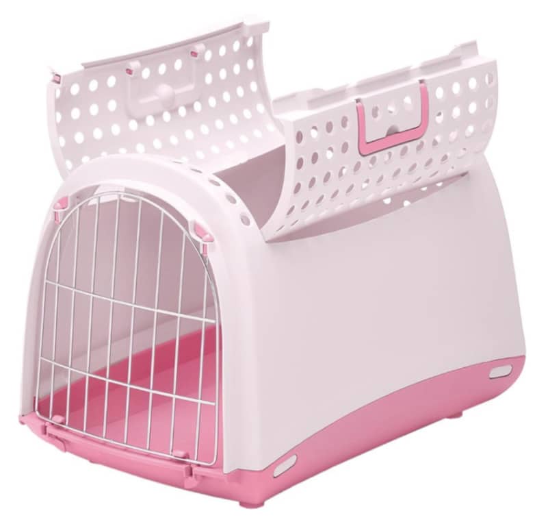 Transportbur som kan öppnas både i taket och framtill för enkel åtkomst.