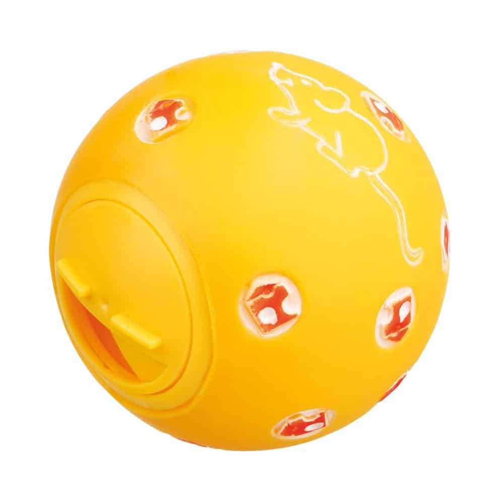 När katten rullar bollen med tassen eller nosen, ramlar godiset ut som en belöning för dess ansträngningar.