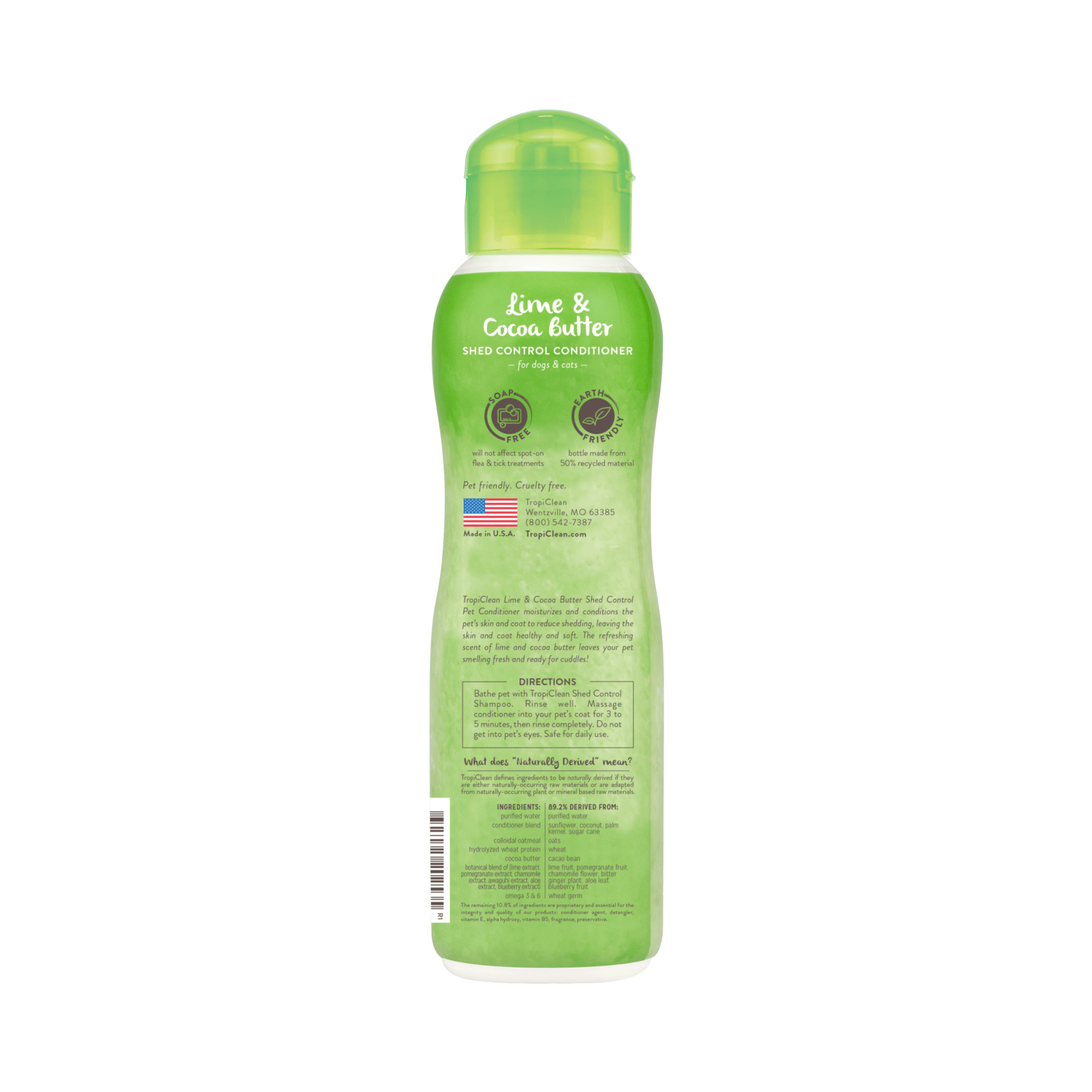 TropiClean Shed Control Lime Cocoa Conditioner kommer från USA och är helt fri från tvål, parabener och färgämnen. Den naturliga formeln gör produkten till ett skonsamt men effektivt alternativ i din husdjurs vårdrutin.