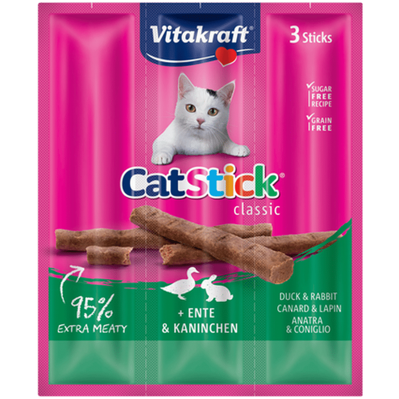 Vitakraft Cat Sticks Mini med smak av anka och kanin är ett otroligt smakrikt kattgodis som de flesta katter älskar. Dessa köttrika sticks kommer i ett praktiskt 3-pack och är perfekta som en belöning eller ett mellanmål.